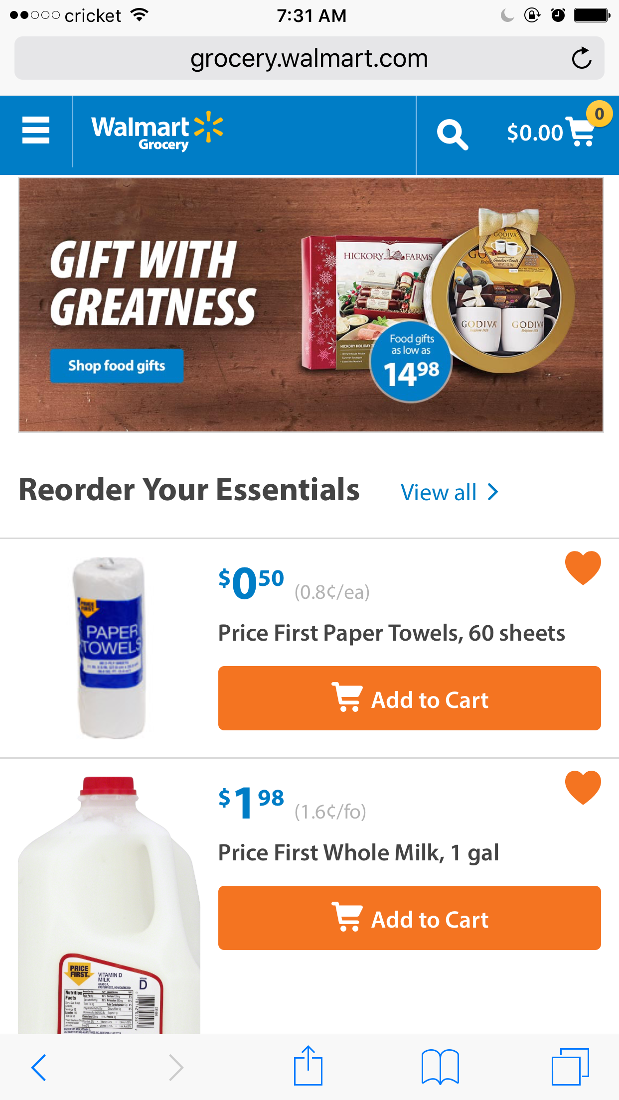 - It's SO fast! It takes me about 15-20 minutes to grocery shop for two weeks worth of food- amazing right?! I just pull the link up on my phone, order from my "essentials" (the groceries I tend to buy each time) and boom. Done. The first time I did it it took a little over an hour because I had to search each item, but I was able to save each item I bought regularly and now they list those items all in one place for me, so it's crazy fast.